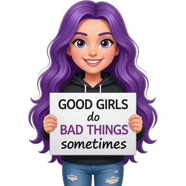 girl with long purple hair holding a GOOD GIRLS do BAD THINGS sometimes sign emoji