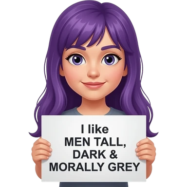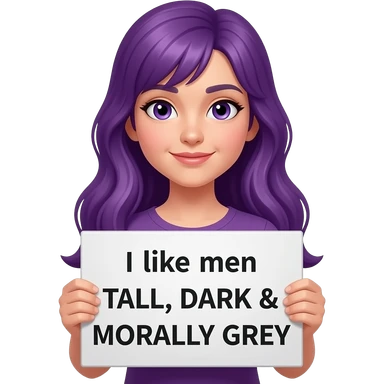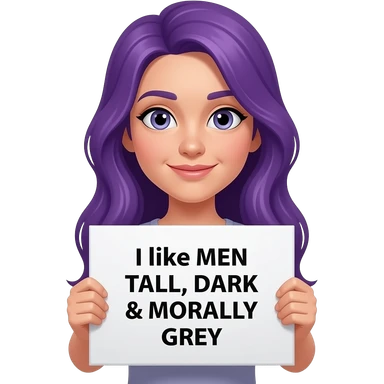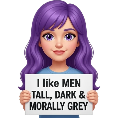girl with long purple hair holding a I like men TALL, DARK & MORALLY GREY sign emoji