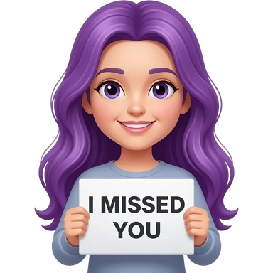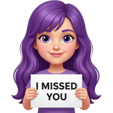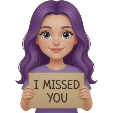 girl with long purple hair holding a I MISSED YOU sign emoji