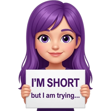 girl with long purple hair holding a I'M SHORT but I am trying... sign emoji