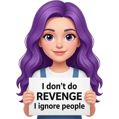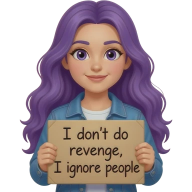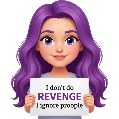 girl with long purple hair holding a I don't do REVENGE I ignore people sign emoji