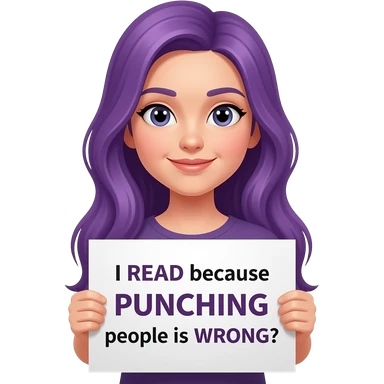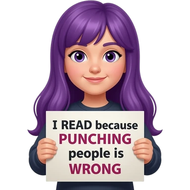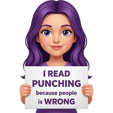 girl with long purple hair holding a I READ because PUNCHING people is WRONG sign emoji