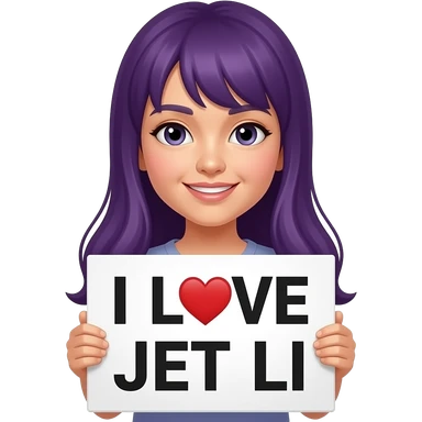 girl with long purple hair holding a I LOVE JET LI sign emoji