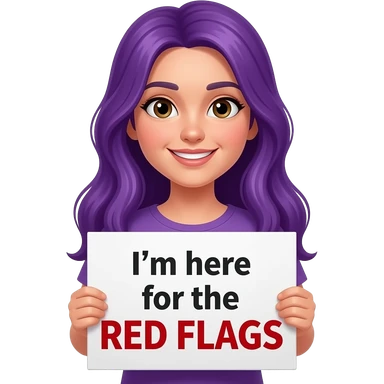 girl with long purple hair holding a I'm here for the RED FLAGS sign emoji