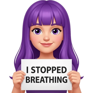 girl with long purple hair holding a I STOPPED BREATHING sign emoji