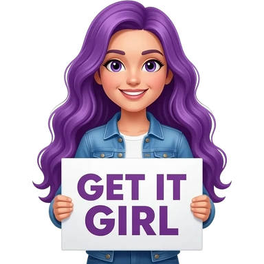 girl with long purple hair holding a GET IT GIRL sign emoji