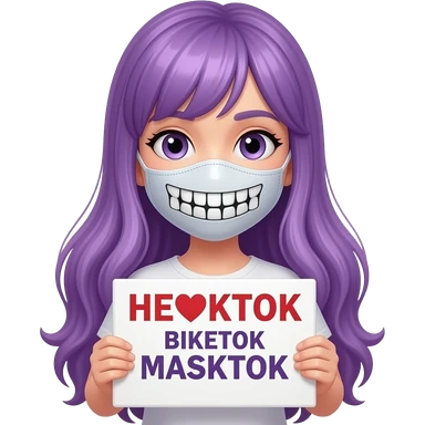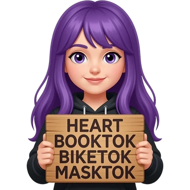 girl with long purple hair holding a HEART BOOKTOK BIKETOK MASKTOK sign emoji