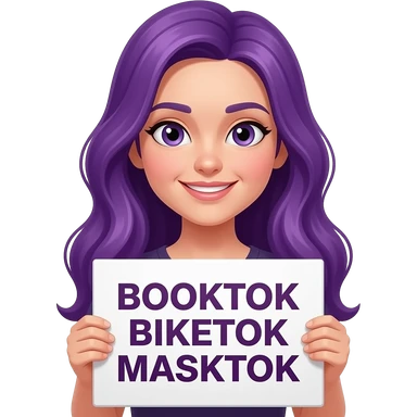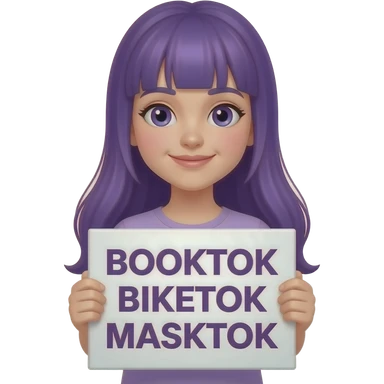 girl with long purple hair holding a BOOKTOK BIKETOK MASKTOK sign emoji