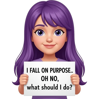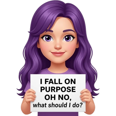 girl with long purple hair holding a I FALL ON PURPOSE... OH NO, what should I do? sign emoji