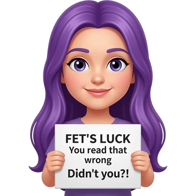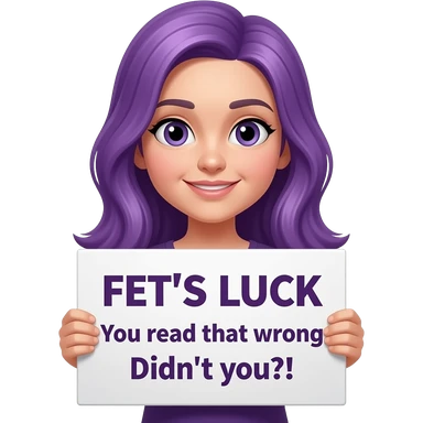 girl with long purple hair holding a FET'S LUCK You read that wrong Didn't you?! sign emoji
