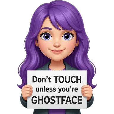 girl with long purple hair holding a Don't TOUCH unless you're GHOSTFACE sign emoji