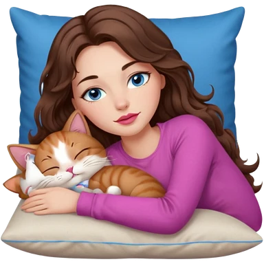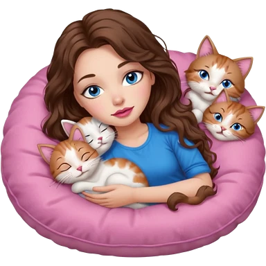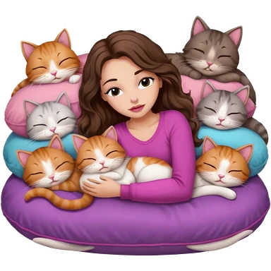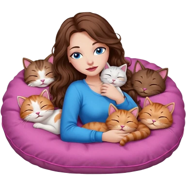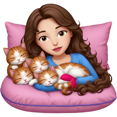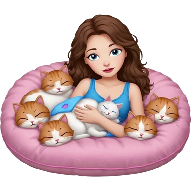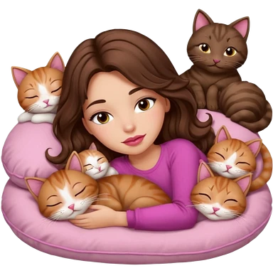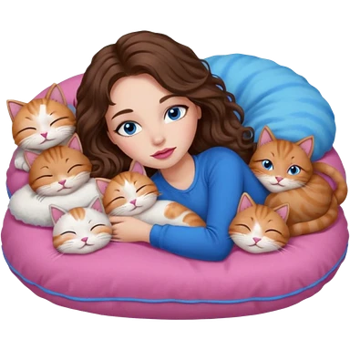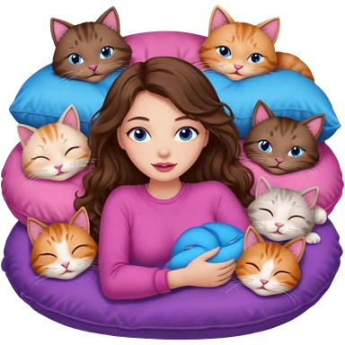 girl with long wavy brown hair, blue eyes, long lashes makeup, sexy pink lips, sleeping on a cozy pillow with 6 cats emoji | AI Emoji Generator