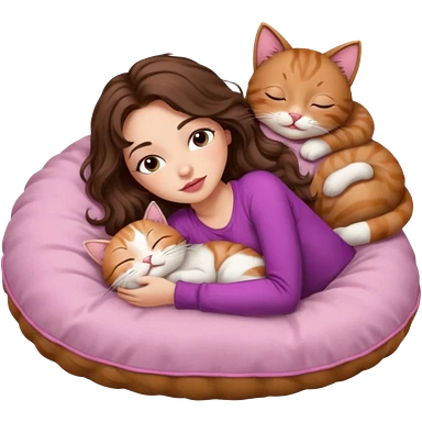 girl with long wavy brown hair, brown eyes, long lashes makeup, sexy pink lips, light to medium complexion, sleeping on a cozy pillow with 6 cats emoji