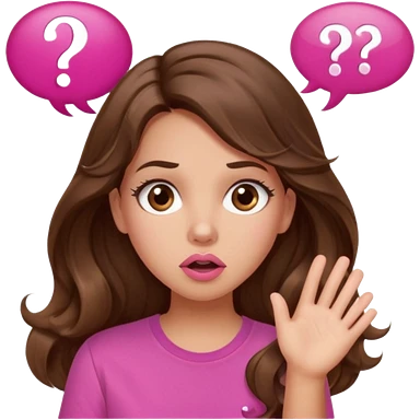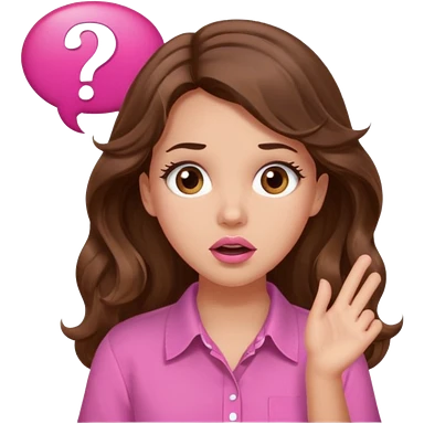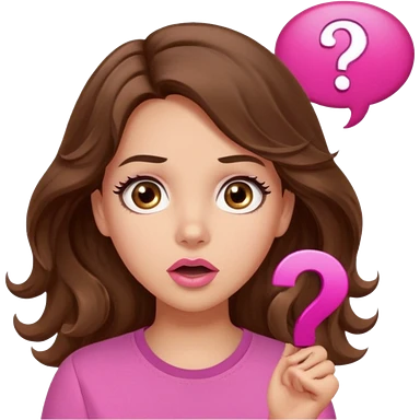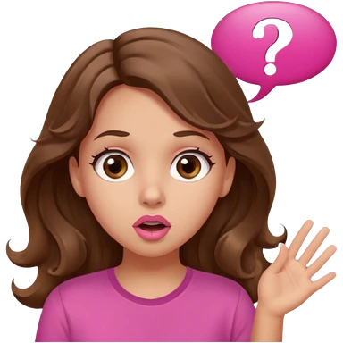 girl with long wavy brown hair, brown eyes, light to medium complexion, in a pink shirt, pink lips, long lashes, surprised, question mark speech bubble emoji