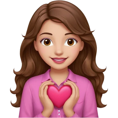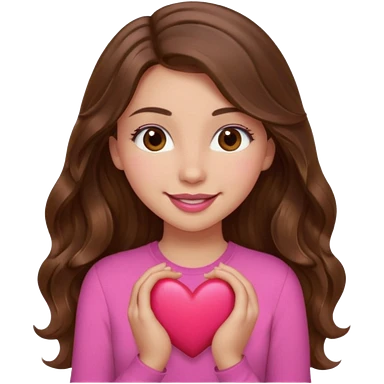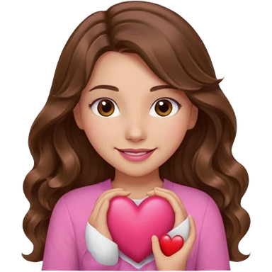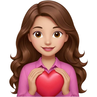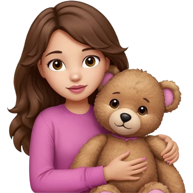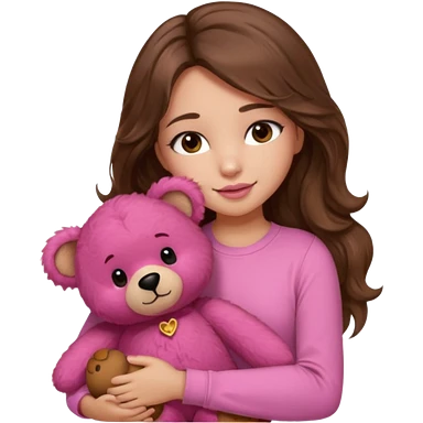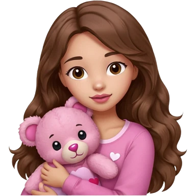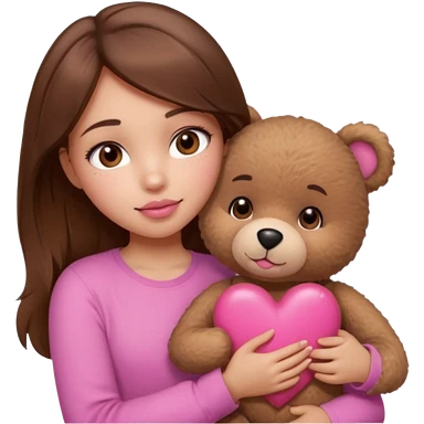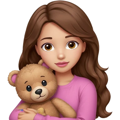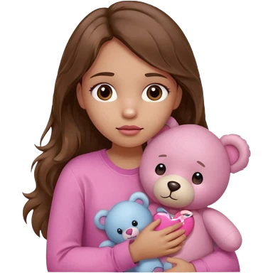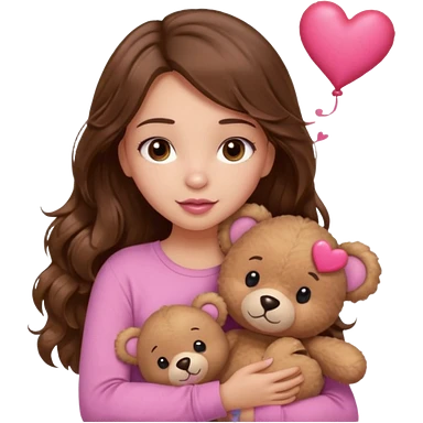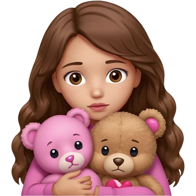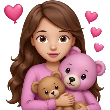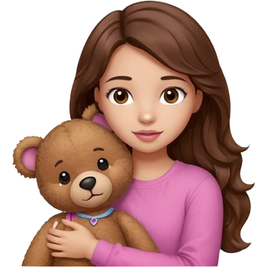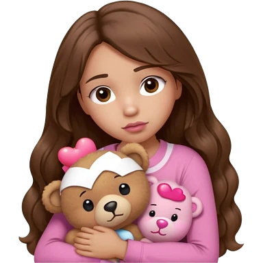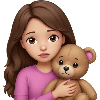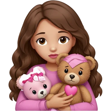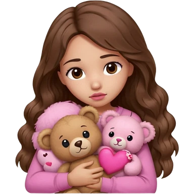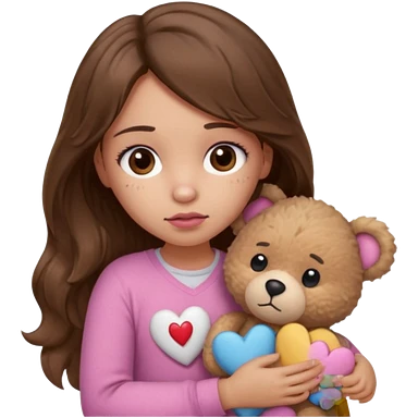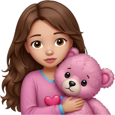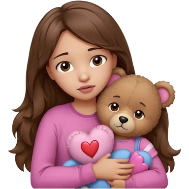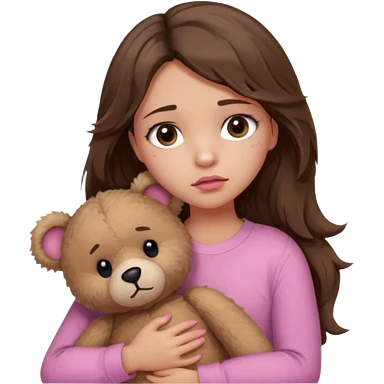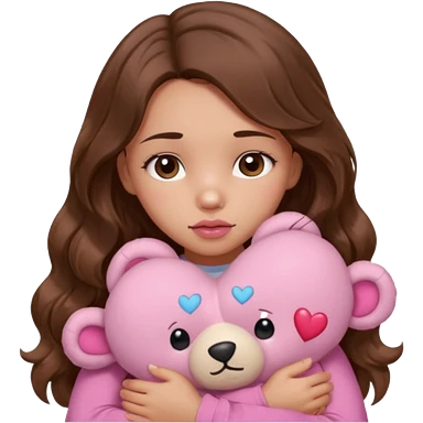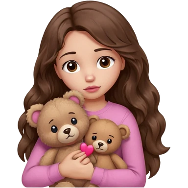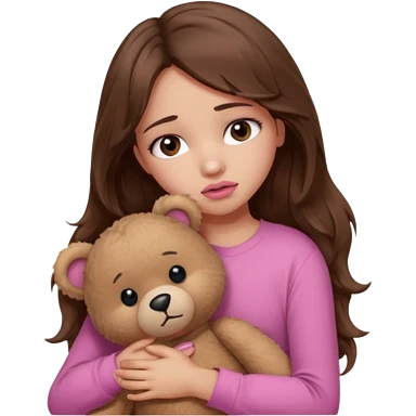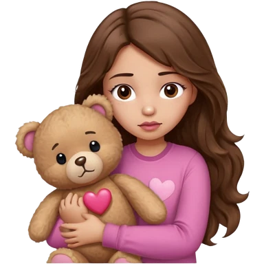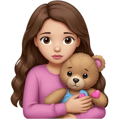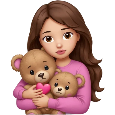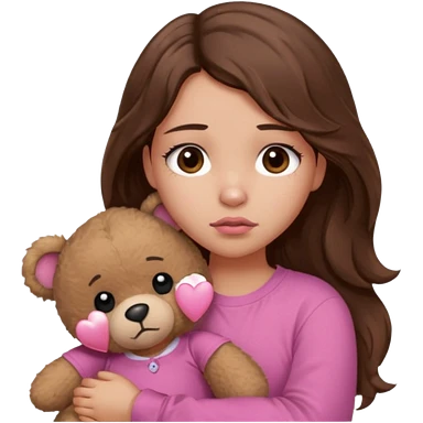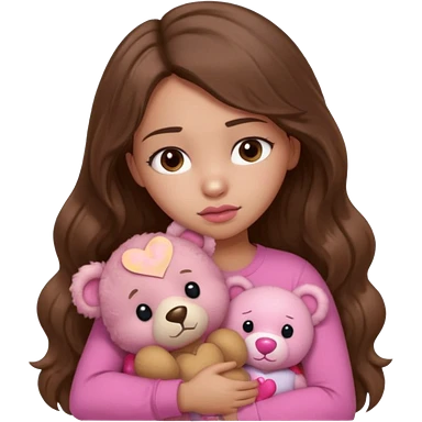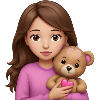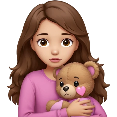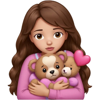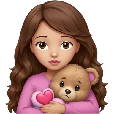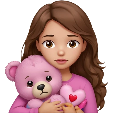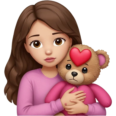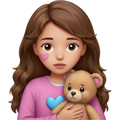 girl with long wavy brown hair, brown eyes, light to medium complexion, in a pink shirt, pink lips, long lashes, sad crying , hugging a teddy bear with a heart emoji | AI Emoji Generator