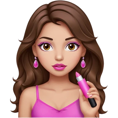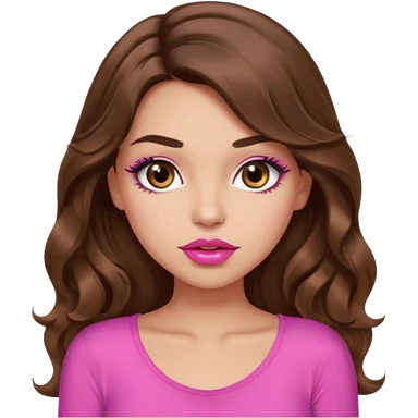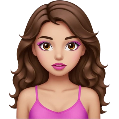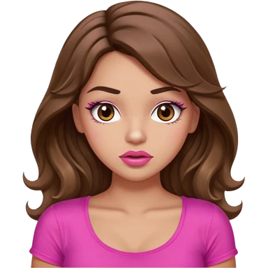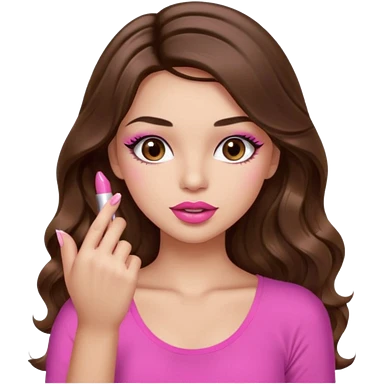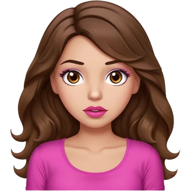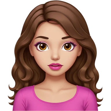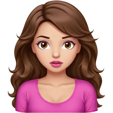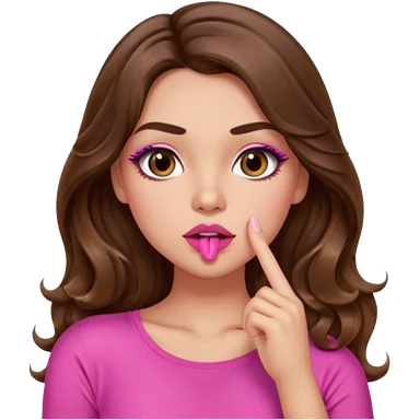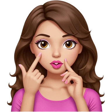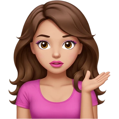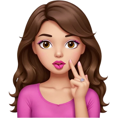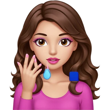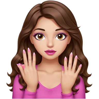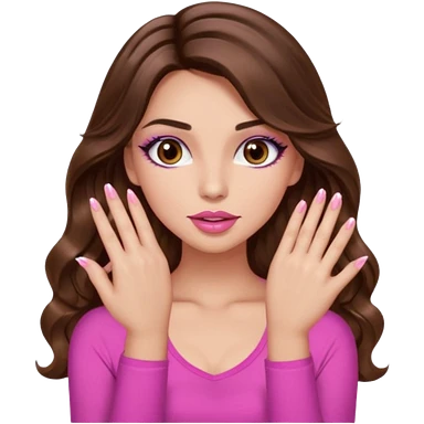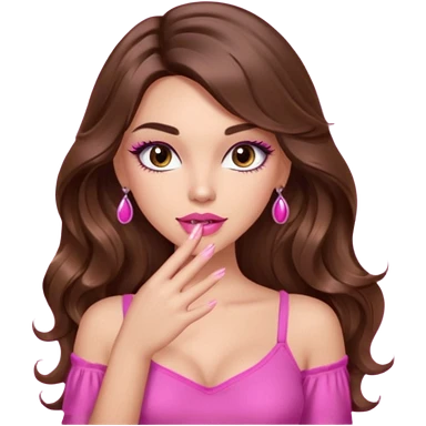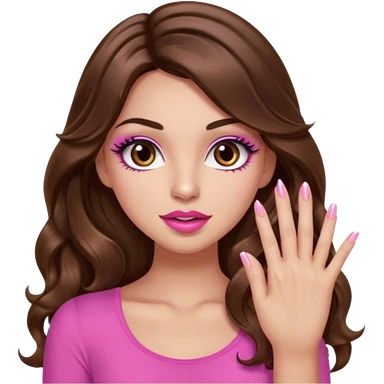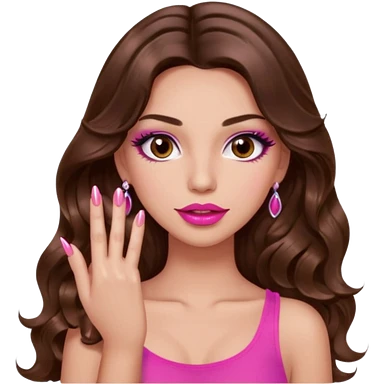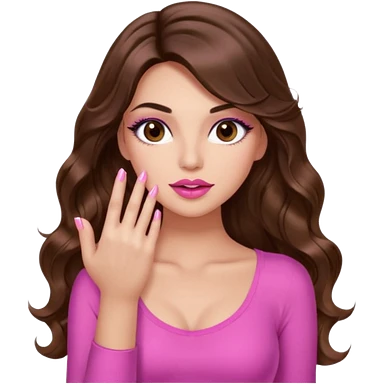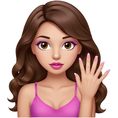 girl with long wavy brown hair, brown eyes, light to medium complexion, in a pink sexy top, pink puckered lips, long lashes, showing a manicure emoji | AI Emoji Generator