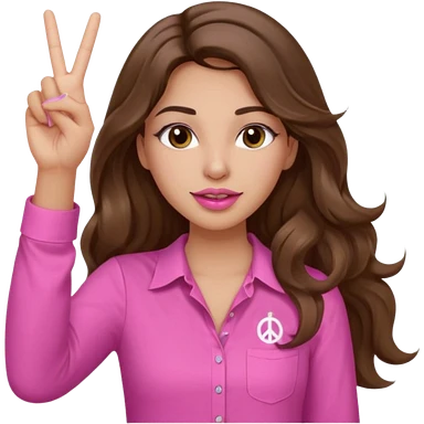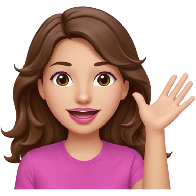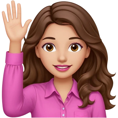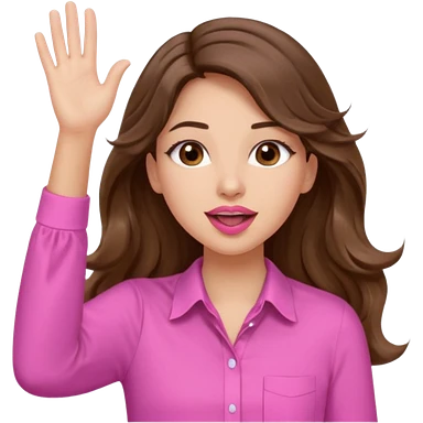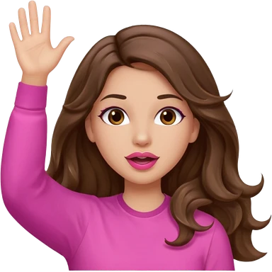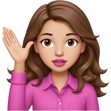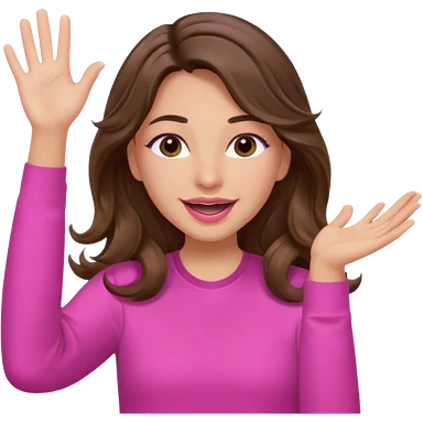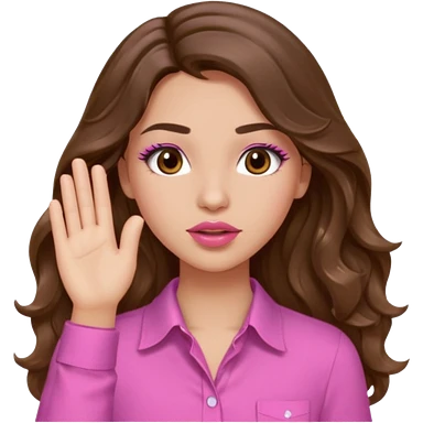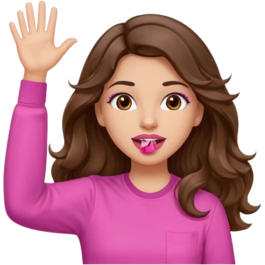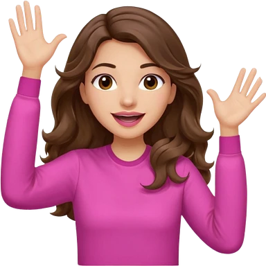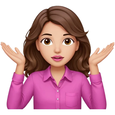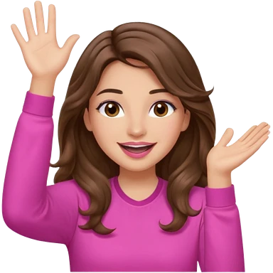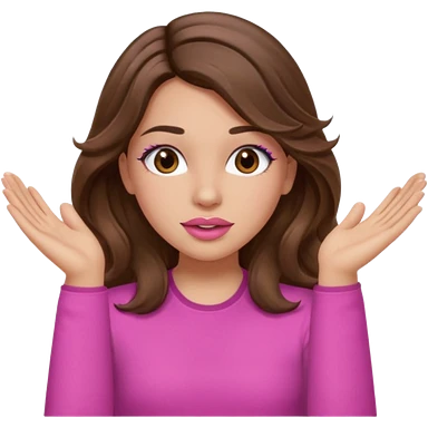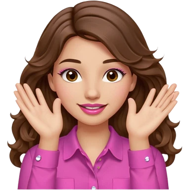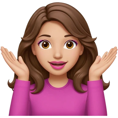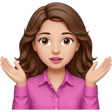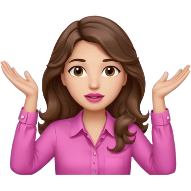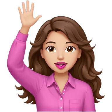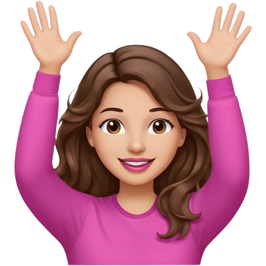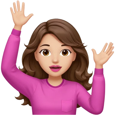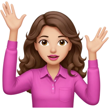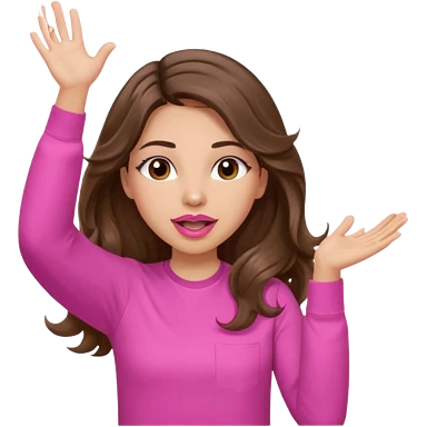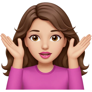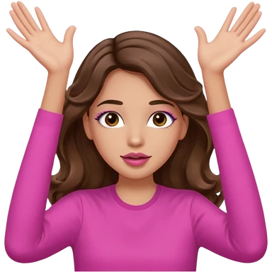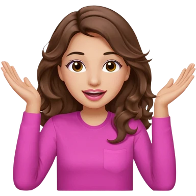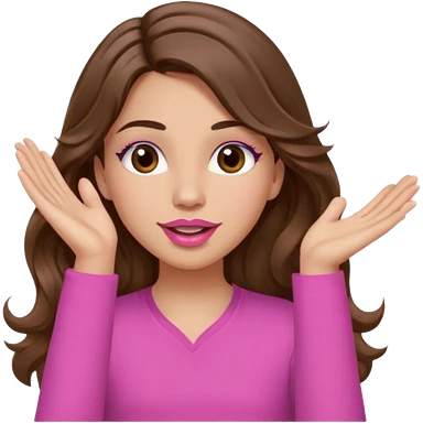 girl with long wavy brown hair, brown eyes, light to medium complexion, in a pink shirt, pink lips, long lashes, puckered lips, both hands all the way up for worship emoji | AI Emoji Generator