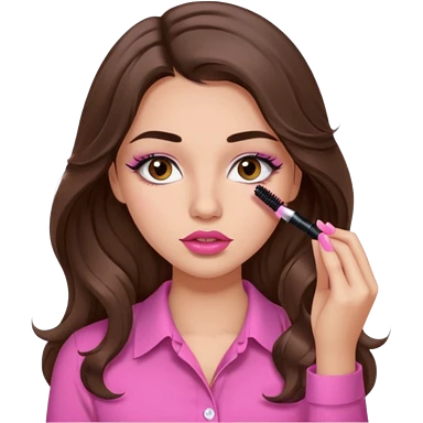 girl with long wavy brown hair, brown eyes, light to medium complexion, in a pink shirt, pink lips, long lashes, puckered lips, hallelujahemoji