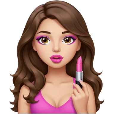 girl with long wavy brown hair, brown eyes, light to medium complexion, in a pink shirt, pink lips, long lashes, puckered lips, putting on blush emoji | AI Emoji Generator