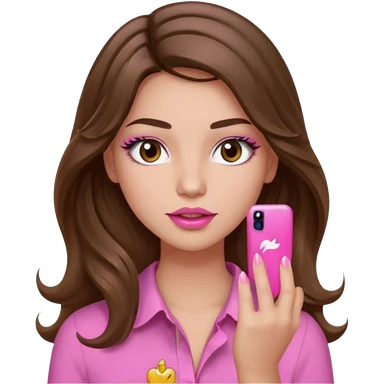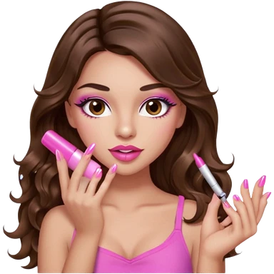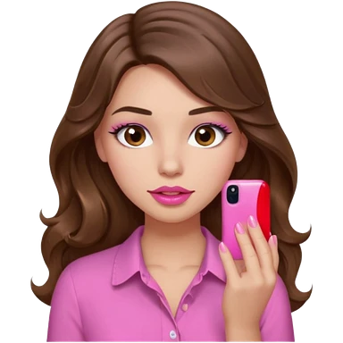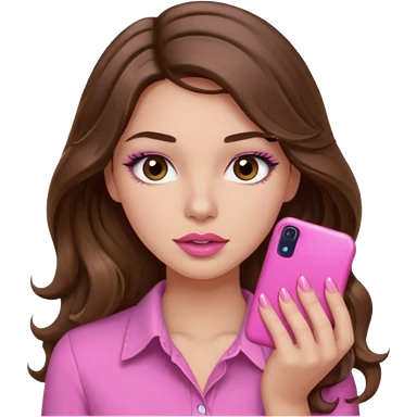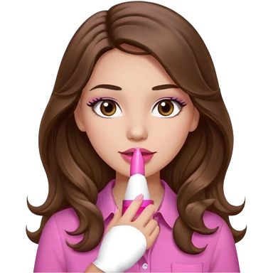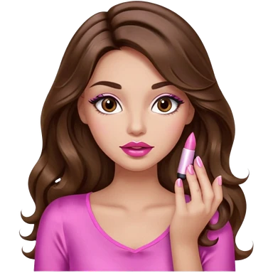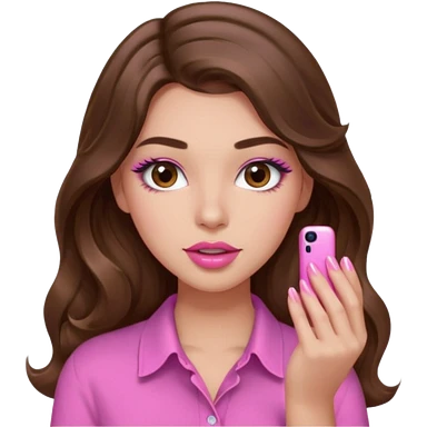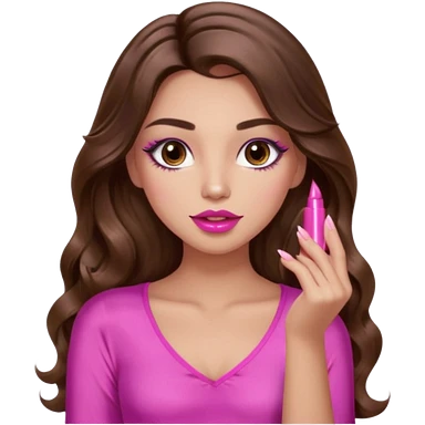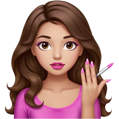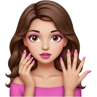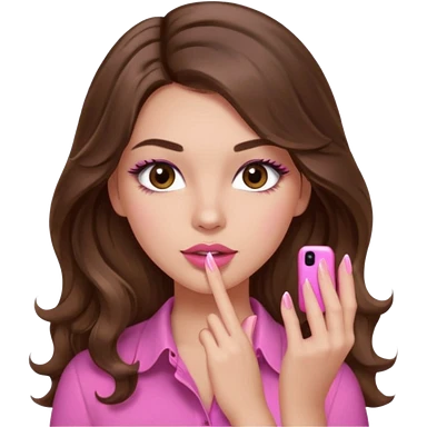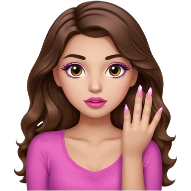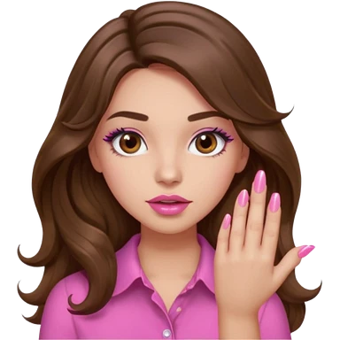 girl with long wavy brown hair, brown eyes, light to medium complexion, in a pink shirt, pink lips, long lashes, puckered lips, showing finger nails emoji | AI Emoji Generator
