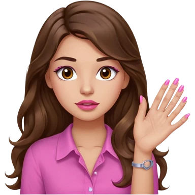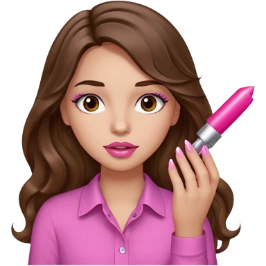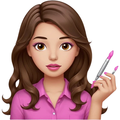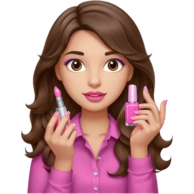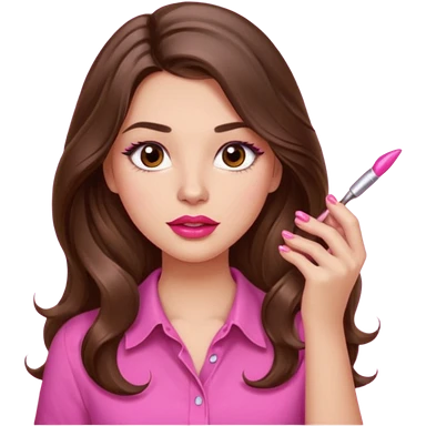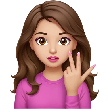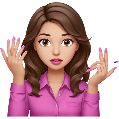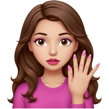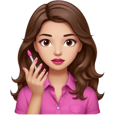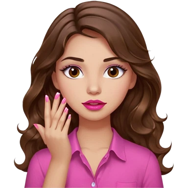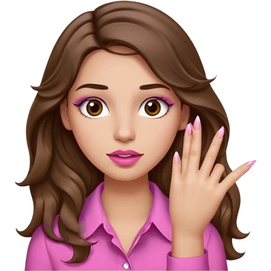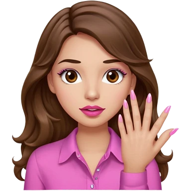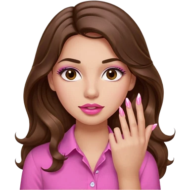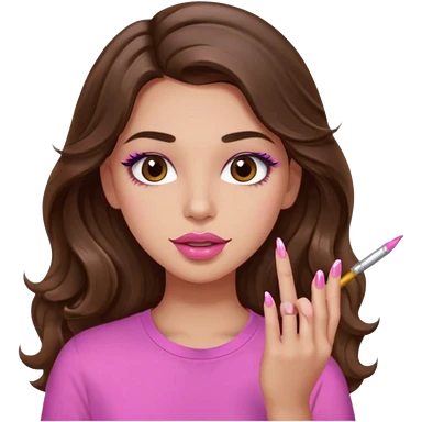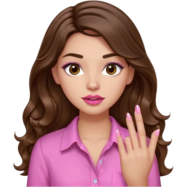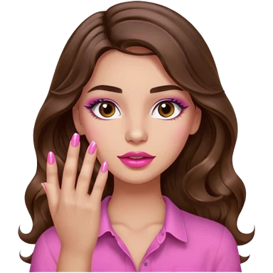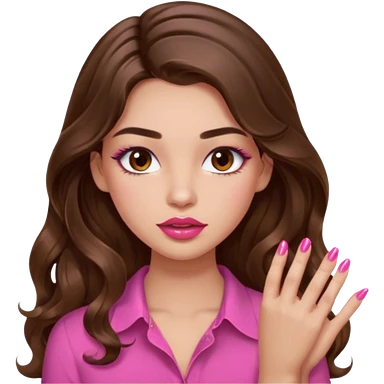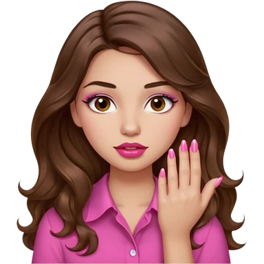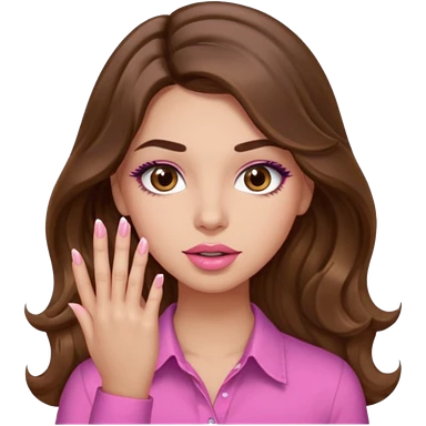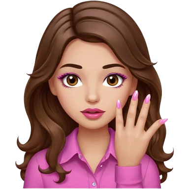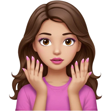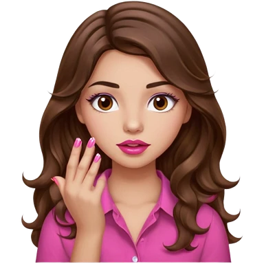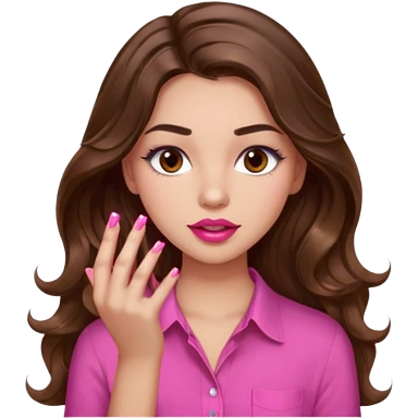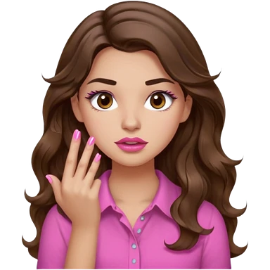 girl with long wavy brown hair, brown eyes, light to medium complexion, in a pink shirt, pink lips, long lashes, puckered lips, painting long nails emoji | AI Emoji Generator