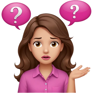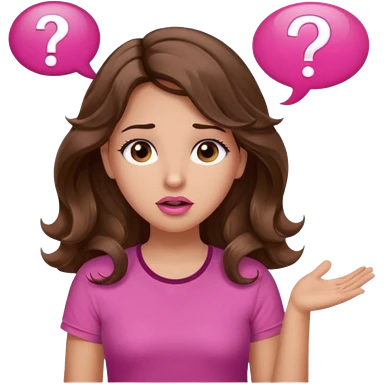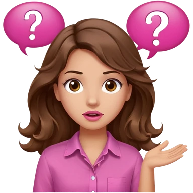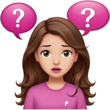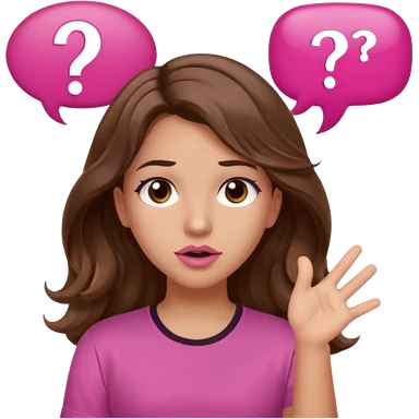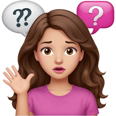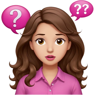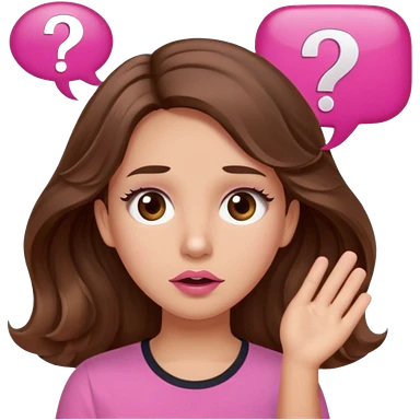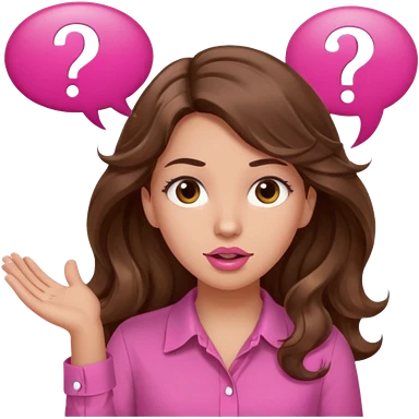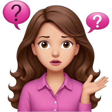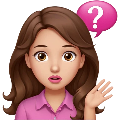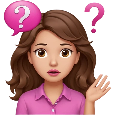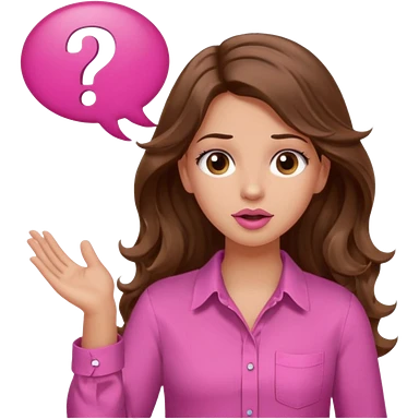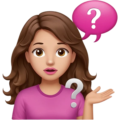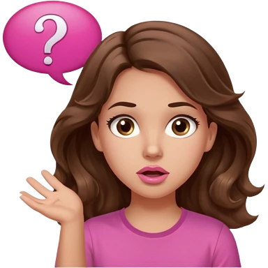 girl with long wavy brown hair, brown eyes, light to medium complexion, in a pink shirt, pink lips, long lashes, surprised, question mark speech bubble emoji | AI Emoji Generator