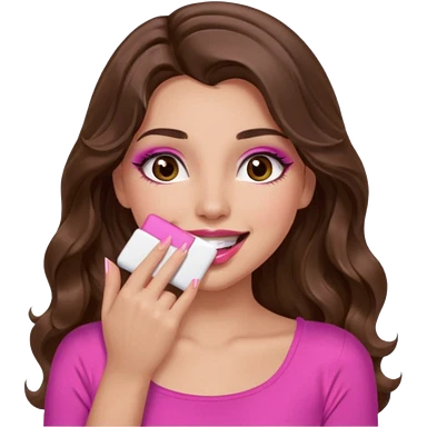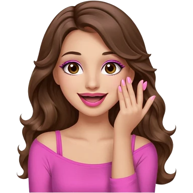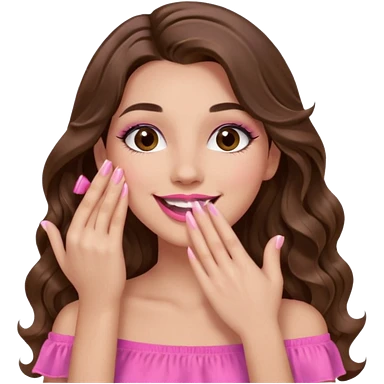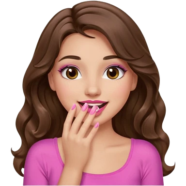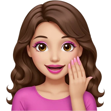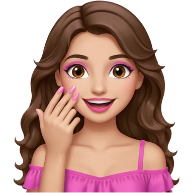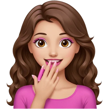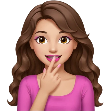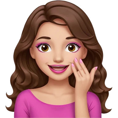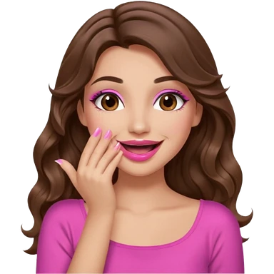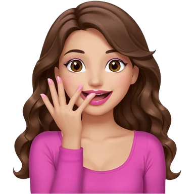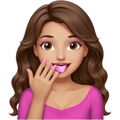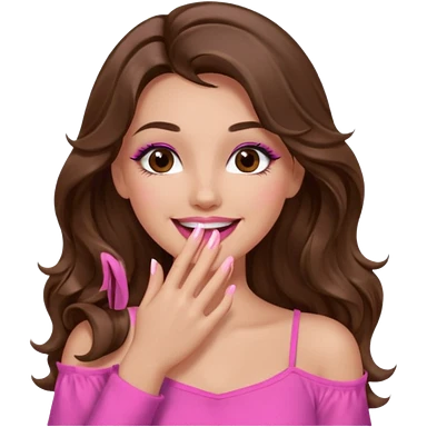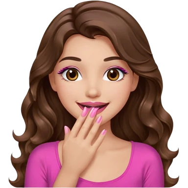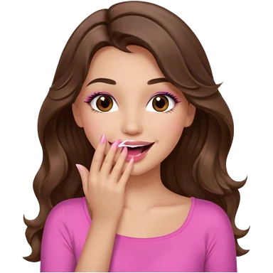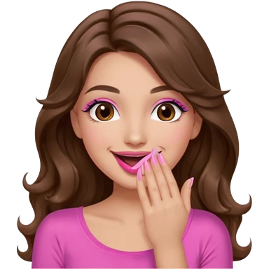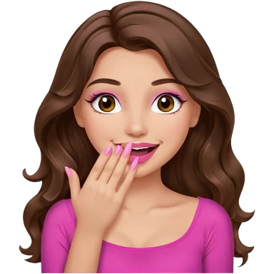 girl with long wavy brown hair, brown eyes, long lashes makeup, pink lips, light to medium complexion, pink sexy top, smiling, hand covering mouth, giggling emoji | AI Emoji Generator