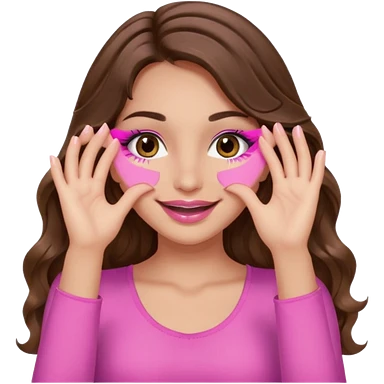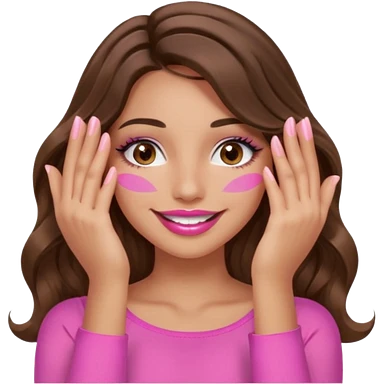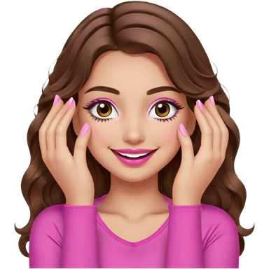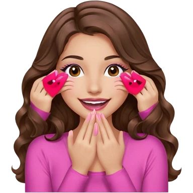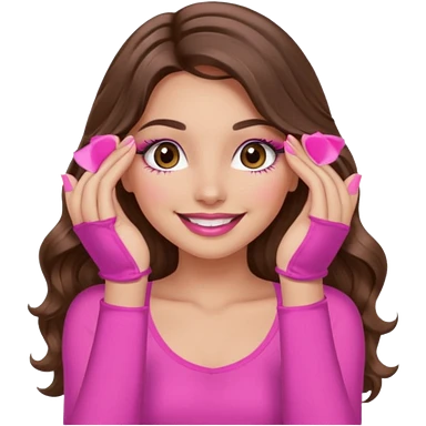 girl with long wavy brown hair, brown eyes, long lashes makeup, sexy pink lips, light to medium complexion, wearing a pink sexy top, smiling, hands covering over the eyesemoji
