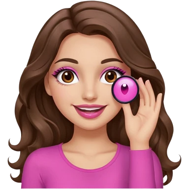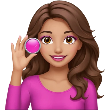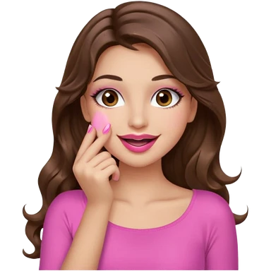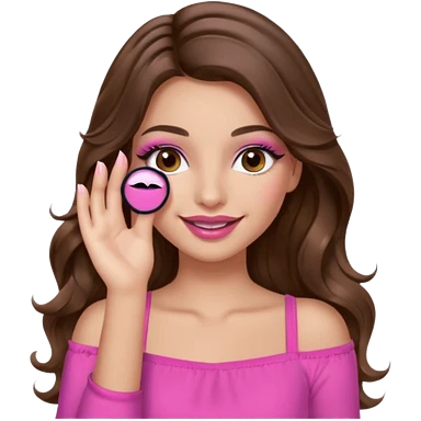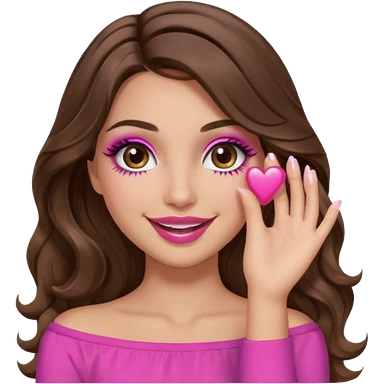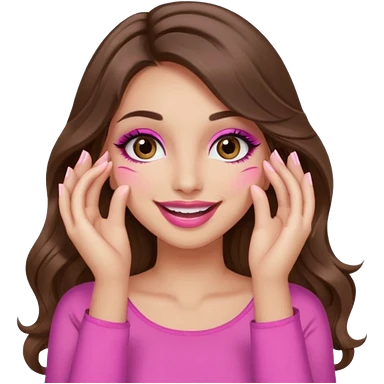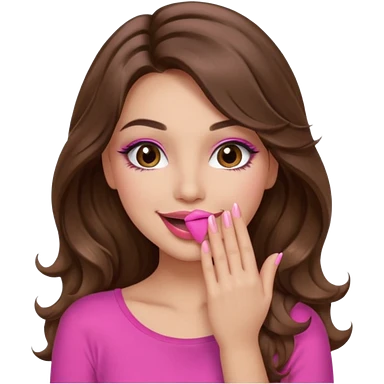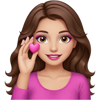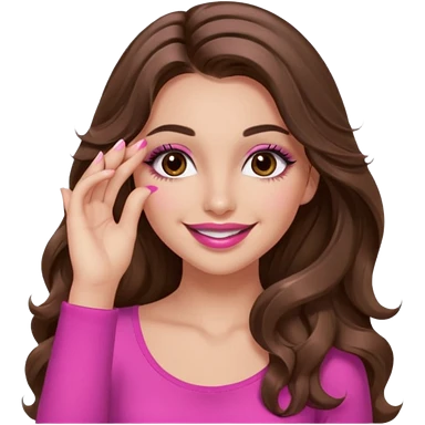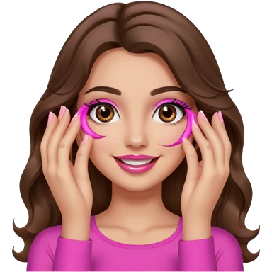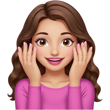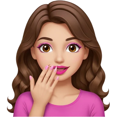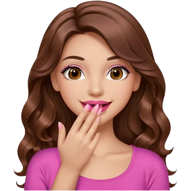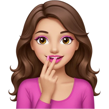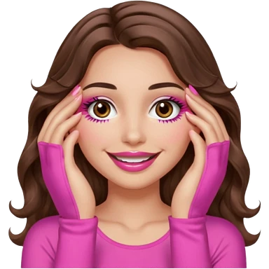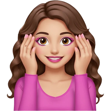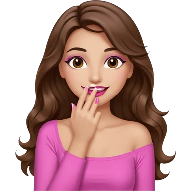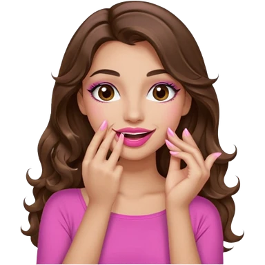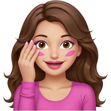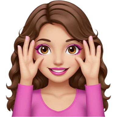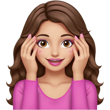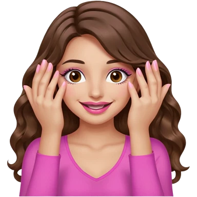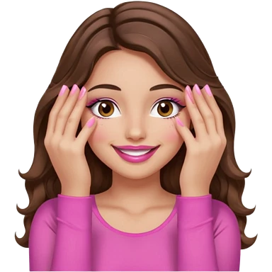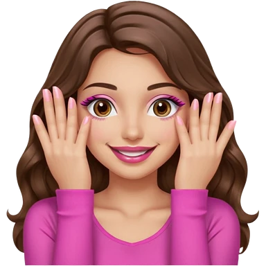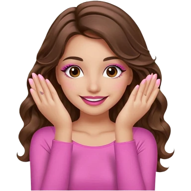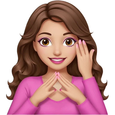 girl with long wavy brown hair, brown eyes, long lashes makeup, sexy pink lips, light to medium complexion, wearing a pink sexy top, smiling, hands covering over the eyes emoji | AI Emoji Generator