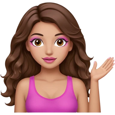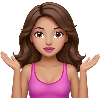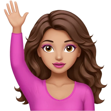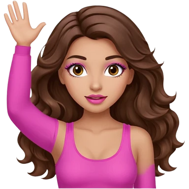 girl with long wavy brown hair, brown eyes, long lashes makeup, sexy pink lips, light to medium complexion, wearing a pink sexy top, both hands in the air high emoji | AI Emoji Generator