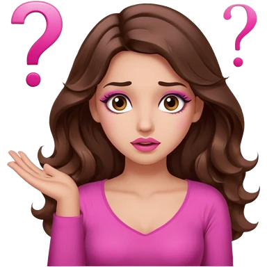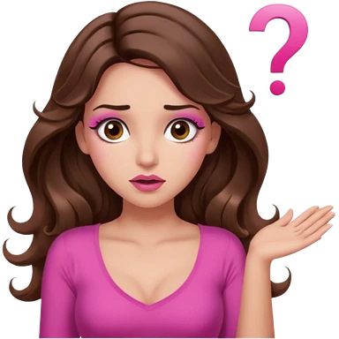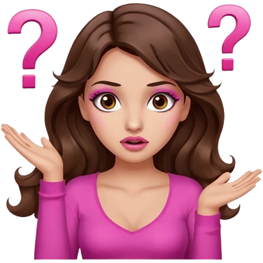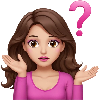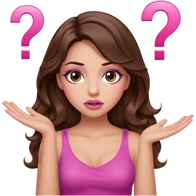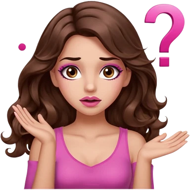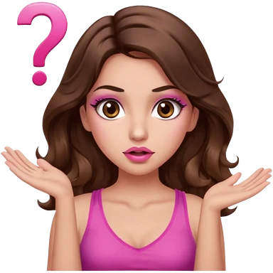 girl with long wavy brown hair, brown eyes, long lashes makeup, sexy pink lips, light to medium complexion, pink sexy top, two hands up, shrugging, confused question mark bubble sign emoji | AI Emoji Generator