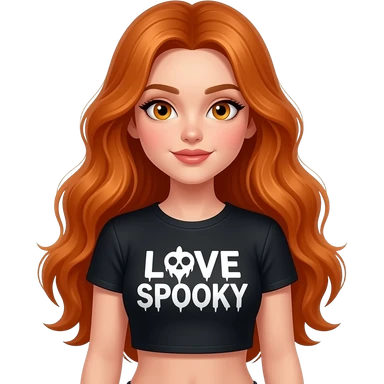 sexy girl with overlong ginger hair and ginger eyes a top with LOVE SPOOKY written on it emoji