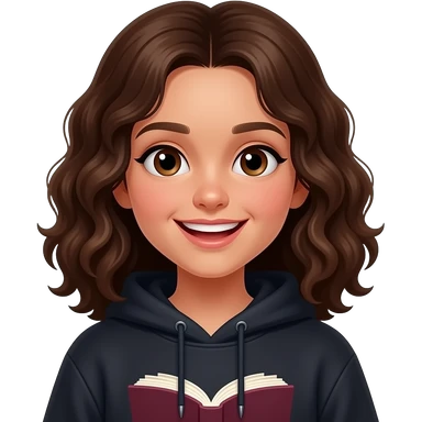 light brown skin 13 yo girl with dark brown loose curls medium length hair who is grinning and wearing a vampire/book themed sweatshirt emoji