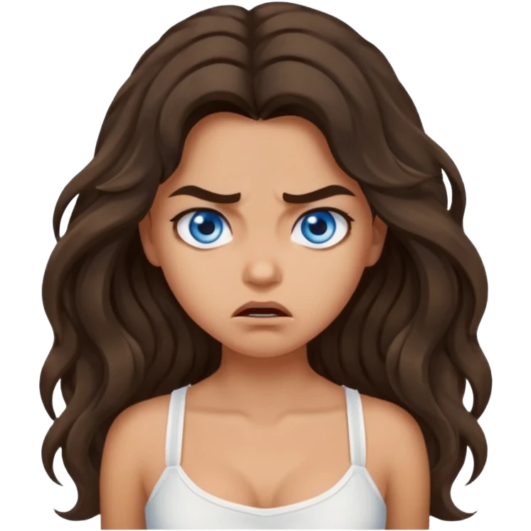 Girl with olive skin, blue eyes, brown dark insanely wavy long hair, white camisole, angry emoji | AI Emoji Generator