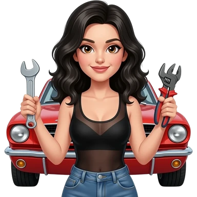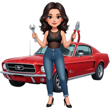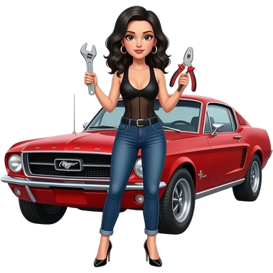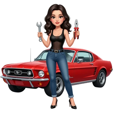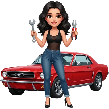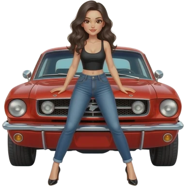 Girl with pale skin and wavy, jet-black hair and brown eye, seen from behind, standing standing hunched forward, looking straight ahead in front of a red 1968 Ford Mustang coupe. Girl wearing a sheer black sleeveless top, jeans. Her legs are spread apart, fingers touching her toes. emoji | AI Emoji Generator