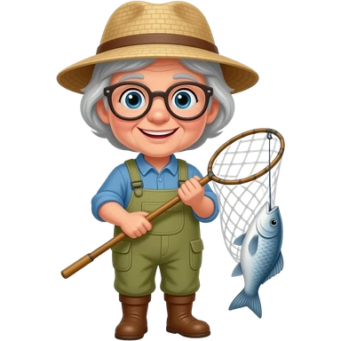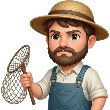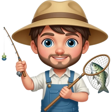 young boy with beard wear fisher clothes and holding fisher net emoji