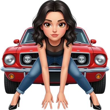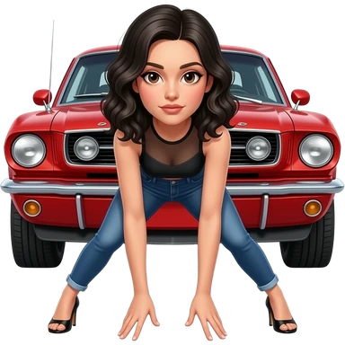 Girl with pale skin and wavy, jet-black hair and brown eye, standing hunched forward, looking straight ahead in front of a red 1968 Ford Mustang coupe. Girl wearing a sheer black sleeveless top, jeans, heels with visible toes. Her legs are spread apart, fingers touching her toes. emoji