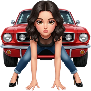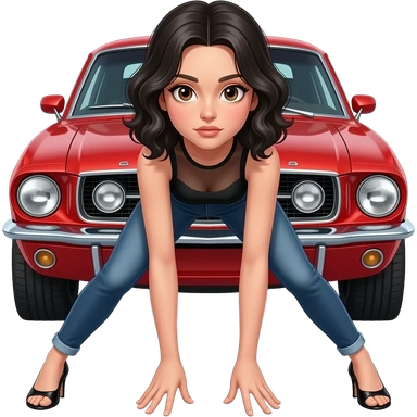 Girl with pale skin and wavy, jet-black hair and brown eye, standing hunched forward, looking straight ahead in front of a red 1968 Ford Mustang coupe. Girl wearing a sheer black sleeveless top, jeans, heels with visible toes. Legs wide spread, fingers on the ground. emoji