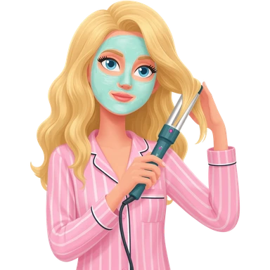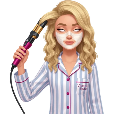 Draw a blonde girl wearing striped Victoria's Secret pajamas, styling her hair with a curling iron, and also apply a skincare mask. emoji