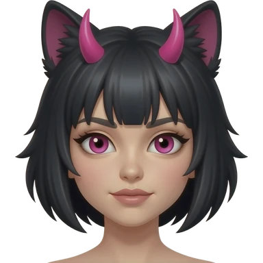 Discord emoji style, female with black wolf cut hair, hot pink eyes, short hot pink horns with fully black cat ears emoji