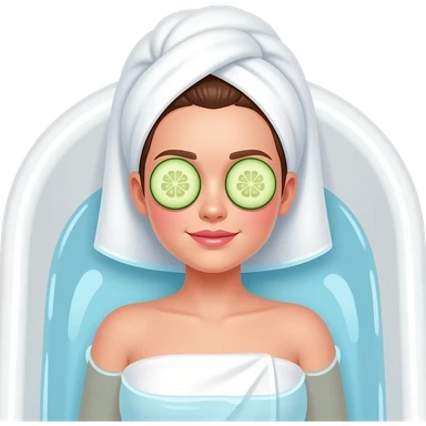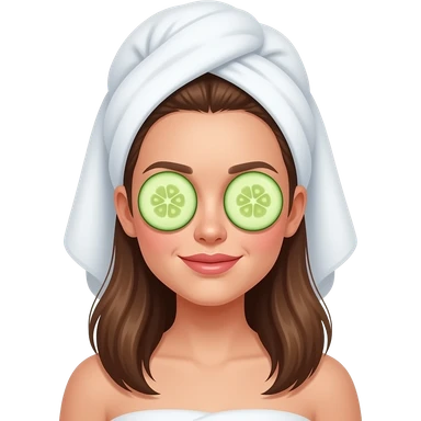 "Aesthetic digital emoji of a young woman with a white towel wrap, green facial mask, and cucumber slices over her eyes, with a soft glow and subtle shading, pastel spa background." emoji