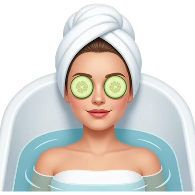 White girl with brown hair full body in a bath tub with cucumbers over her eyes and her hair in a white towel emoji