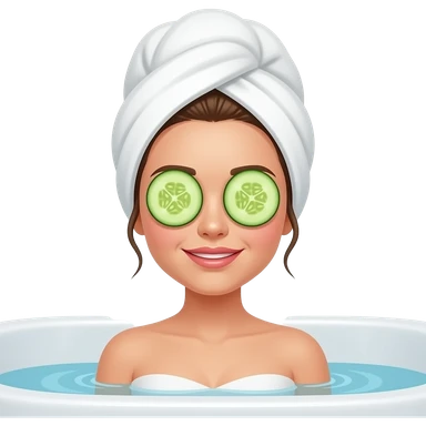 White girl with brown hair in the bath with cucumbers over her eyes and her hair in a white towel emoji