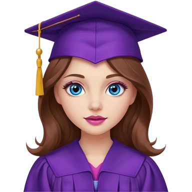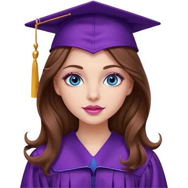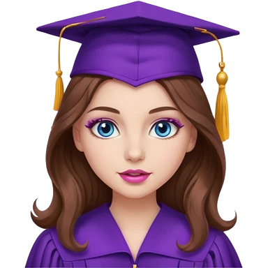 girl with wavy long brown hair, blue eyes, long lashes makeup, sexy pink lips, wearing a purple graduation cap and gown emoji
