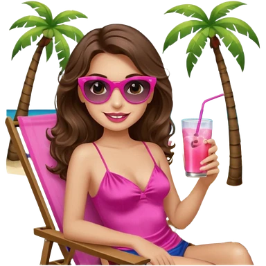 girl with long wavy brown hair, brown eyes, long lashes makeup, sexy pink lips, smiling, light to medium complexion, wearing a pink sexy silk top, relaxing in a beach chair, wearing black sunglasses, holding a drink, palm trees emoji