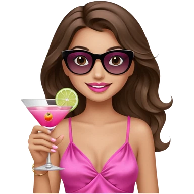 girl with long wavy brown hair, brown eyes, long lashes makeup, sexy pink lips, smiling, light to medium complexion, wearing a pink sexy silk top, relaxing in a beach chair, wearing black sunglasses, holding a drink, palm trees beach background emoji