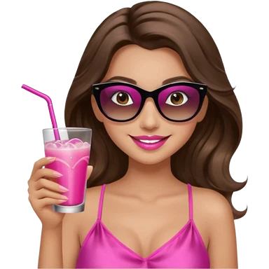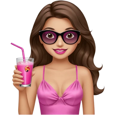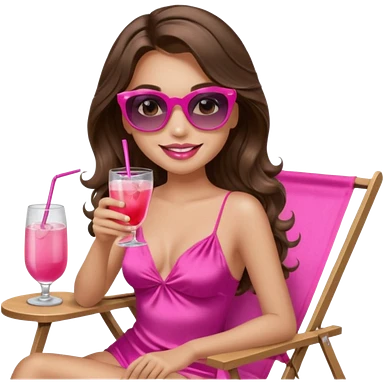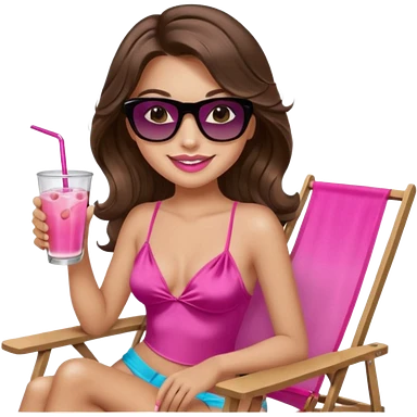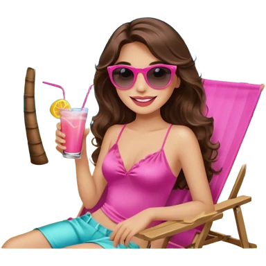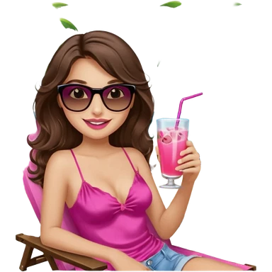 girl with long wavy brown hair, brown eyes, long lashes makeup, sexy pink lips, smiling, light to medium complexion, wearing a pink sexy silk top, relaxing in a beach chair, wearing black sunglasses, holding a drink emoji