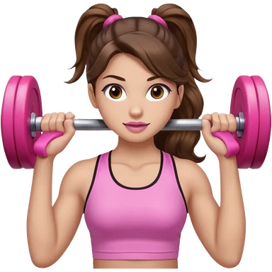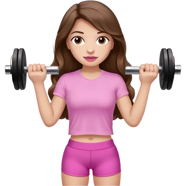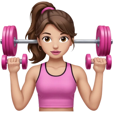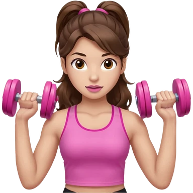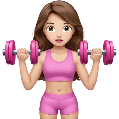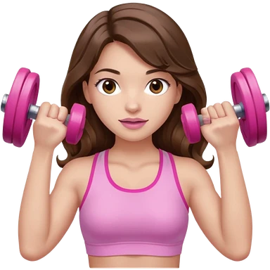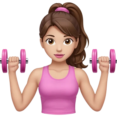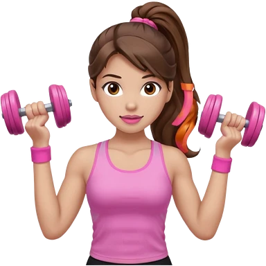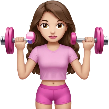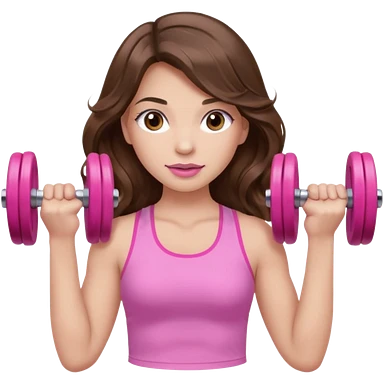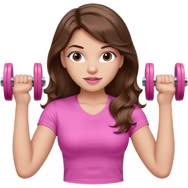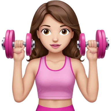 girl with wavy long brown hair, brown eyes, light to medium complexion, long lashes, light pink lipstick, wearing light pink shirt, lifting a pink dumbbells in a sports top emoji | AI Emoji Generator