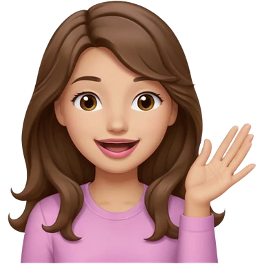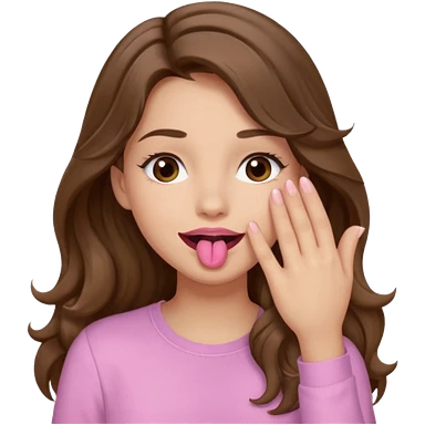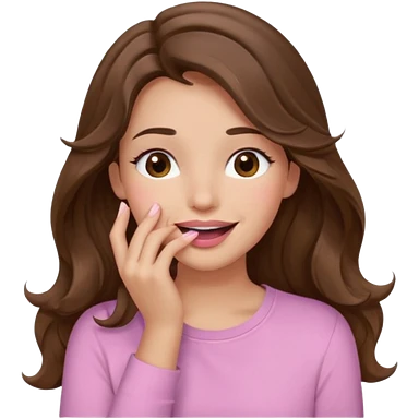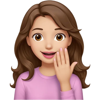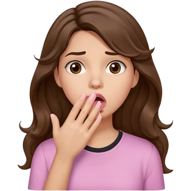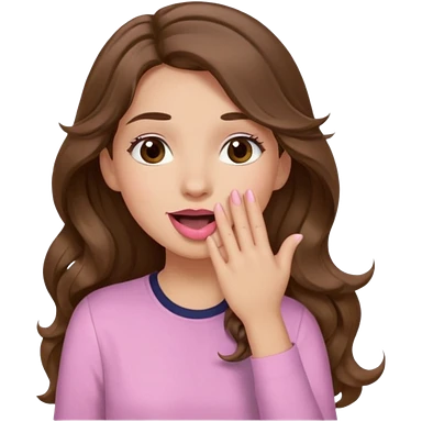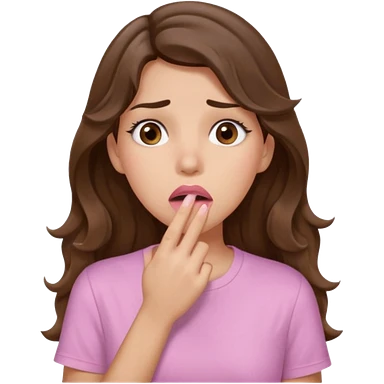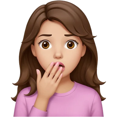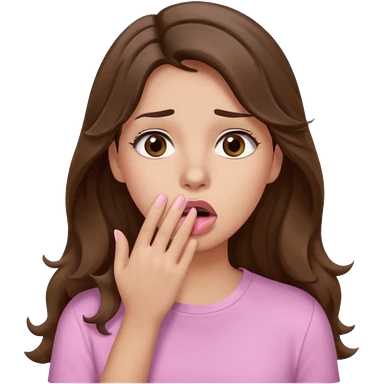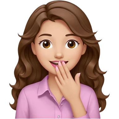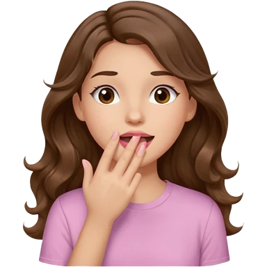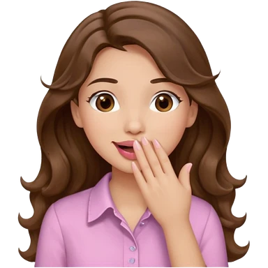 girl with wavy long brown hair, brown eyes, light to medium complexion, long lashes, light pink lipstick, wearing light pink shirt, shocked, hand covering mouth emoji | AI Emoji Generator