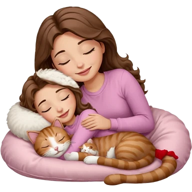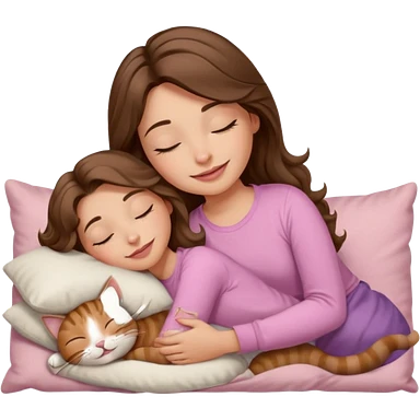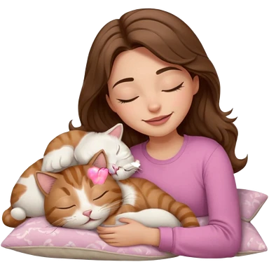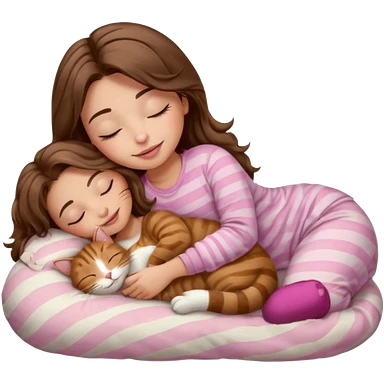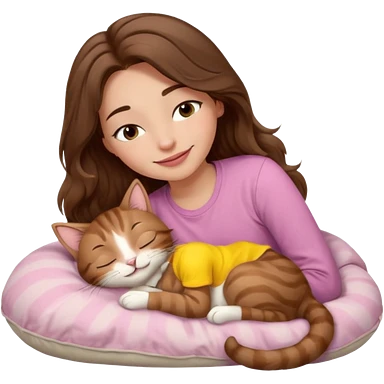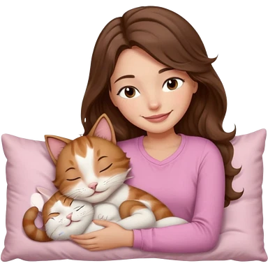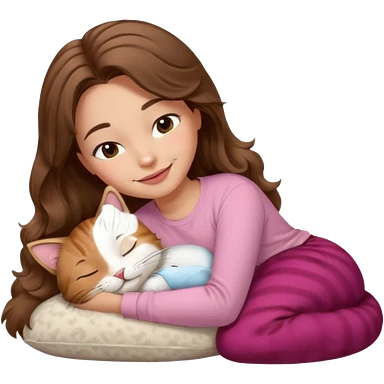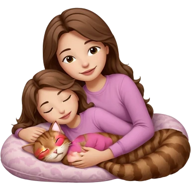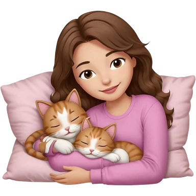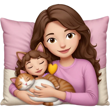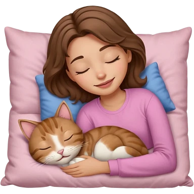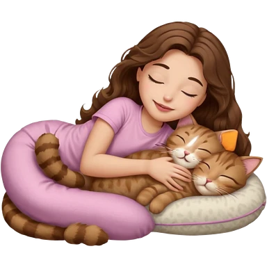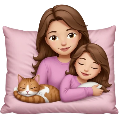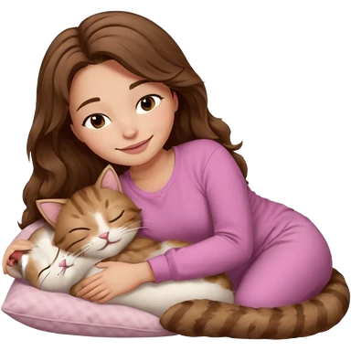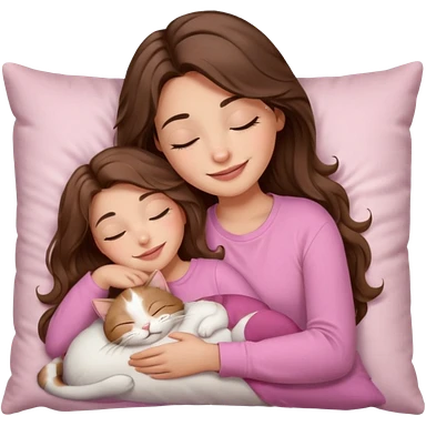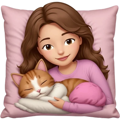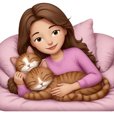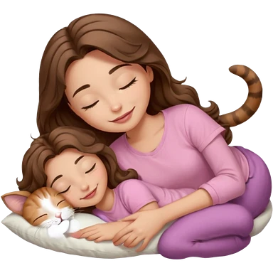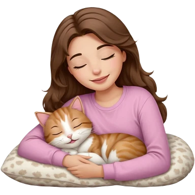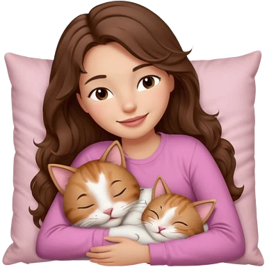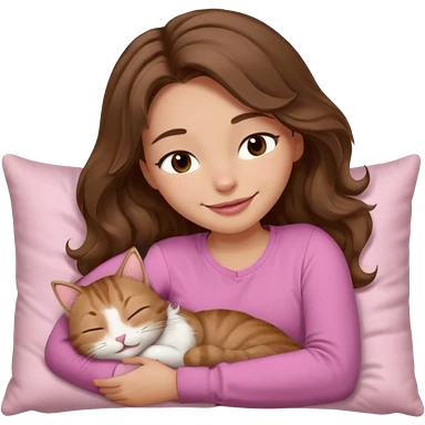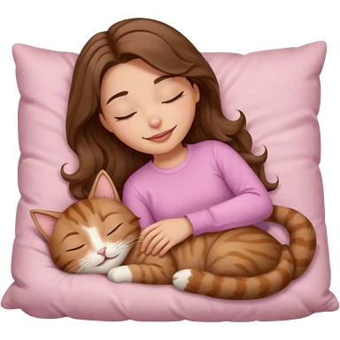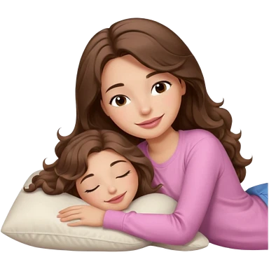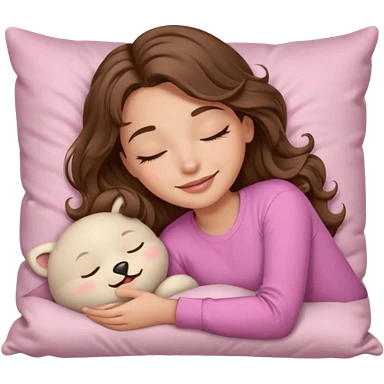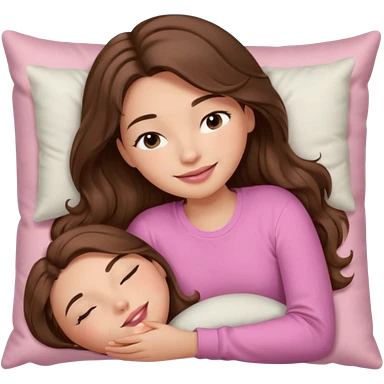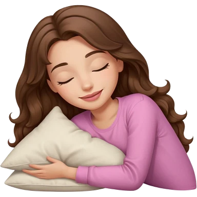 girl with wavy long brown hair, brown eyes, light to medium complexion, long lashes, light pink lipstick, smiling, wearing light pink shirt, sleeping emoji | AI Emoji Generator